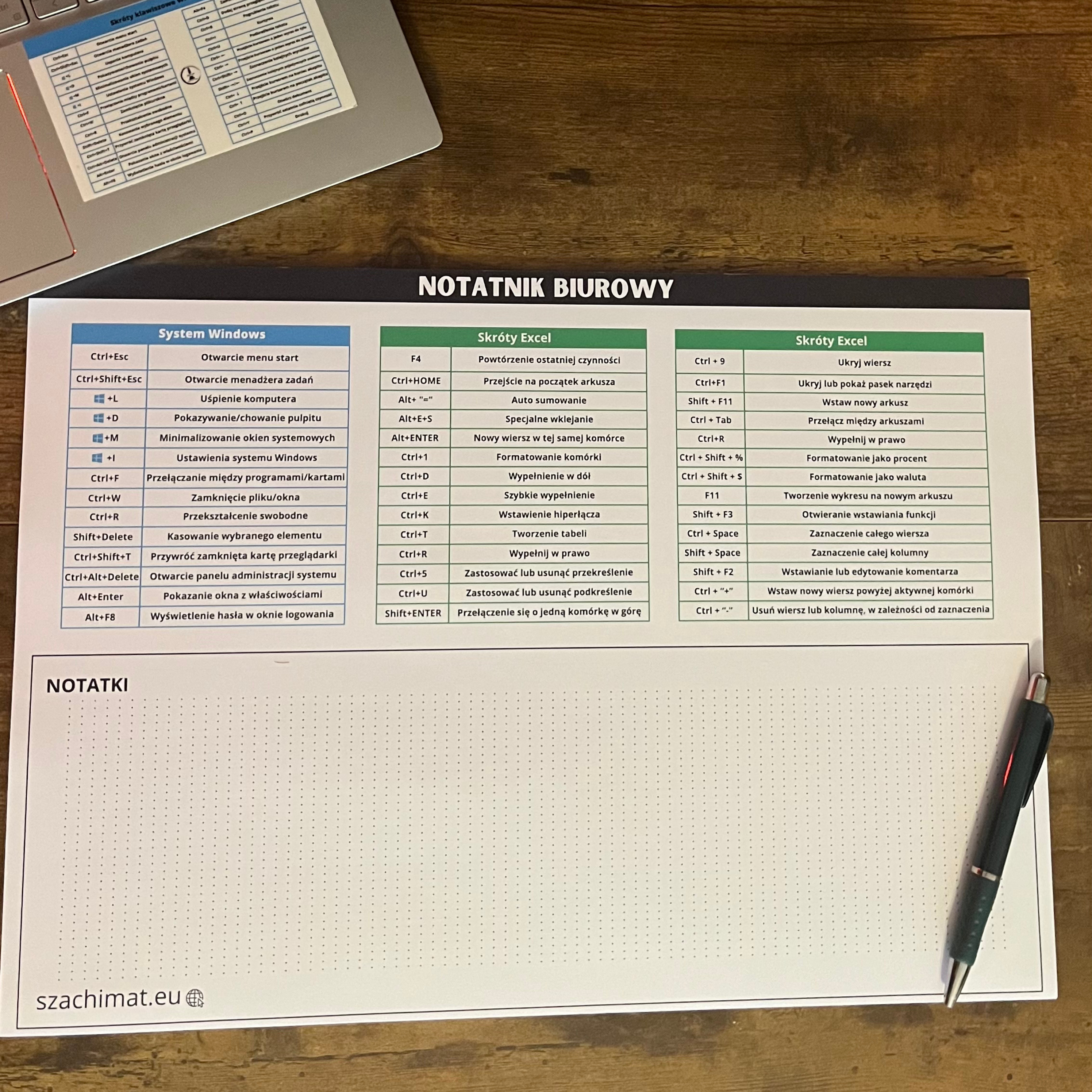 Dzięki temu notatnikowi, masz szybki dostęp do najczęściej używanych skrótów klawiszowych, co znacznie ułatwia codzienną pracę na komputerze. Idealny do biura, szkoły, czy dla każdego, kto ceni sobie porządek i wygodę w jednym.